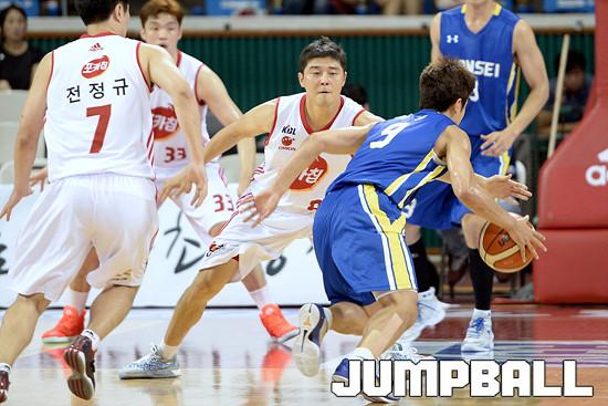 22일 잠실 학생체육관에서 열린 2016 KCC 프로-아마 최강전 연세대 - 오리온 의 경기, 오리온 김도수가 스틸을 하기 위해 손을 뻗고있다.
