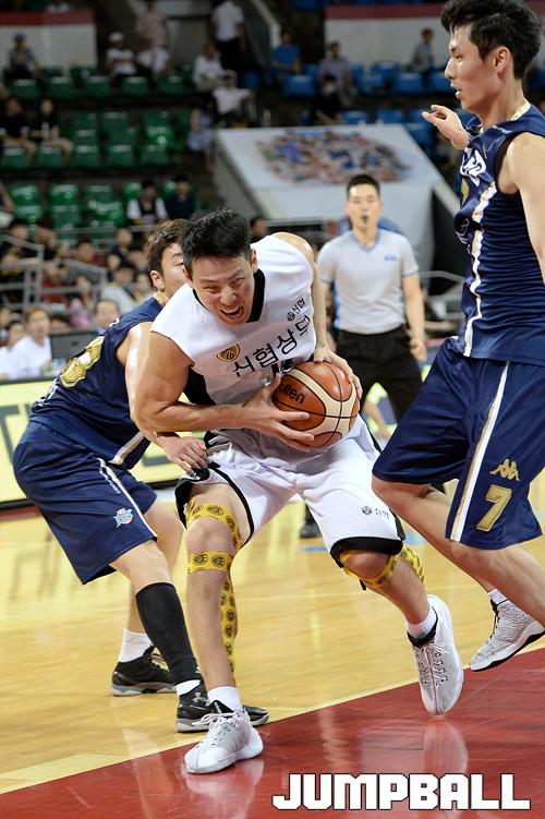 22일 잠실 학생체육관에서 열린 2016 KCC 프로-아마 최강전 KCC - 상무 의 경기, 상무 최부경이 KCC 수비를 뚫고 골밑돌파를 시도하고있다.