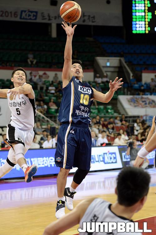 22일 잠실 학생체육관에서 열린 2016 KCC 프로-아마 최강전 KCC - 상무 의 경기, KCC 이현민이 상무 김시래의 수비를 제치고 돌파해 플로터슛을 쏘고있다.