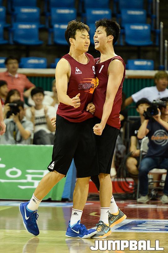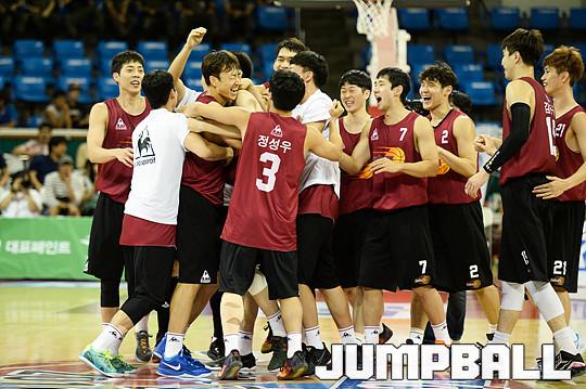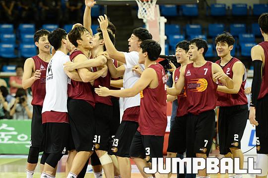 [점프볼=잠실/유용우 기자] 27일 잠실 학생체육관에서 열린 2016 KCC 프로-아마 최강전, 창원 LG와 고양 오리온의 4강전 경기, LG 김영환의 슛으로 역전승을 거두며 동료들과 기뻐하고 있다.