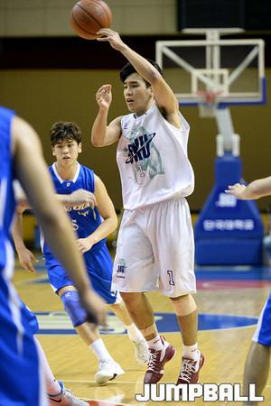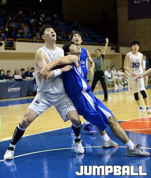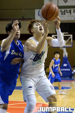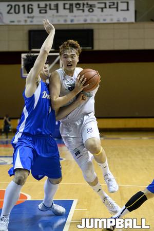 19일 천안 단국대 체육관에서 열린 2016 남녀 대학농구리그 8강 플레이오프 단국대 와 동국대의 경기, 동국대 변준형이 수비를 하는 도중 단국대 하도현에게 반칙을 범하고있다.