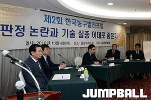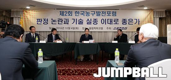 | 04일 오후 2시 서울 방이동 올림픽파크텔 서울홀에서 스포츠조선이 주최하는 제2회 한국농구발전포럼이 열렸다. 포럼은 1부와 2부로 나눠서 진행된다. 지난해 외국인 선수 제도를 다양한 시각으로 다룬데 이어, 올해는 한국농구의 문제점으로 지적받고 있는 판정 논란과 기술 실종의 원인 및 해결 방안에 대해 토론을 진행한다. 점프볼 편집장 손대범의 사회로 포럼이 진행되고있다. (패널은 좌로부터 WKBL 김진수, KBL 이재민 경기본부장, 김태환 MBC스포츠+ 해설위원, 박세운 CBS노컷뉴스 기자) |