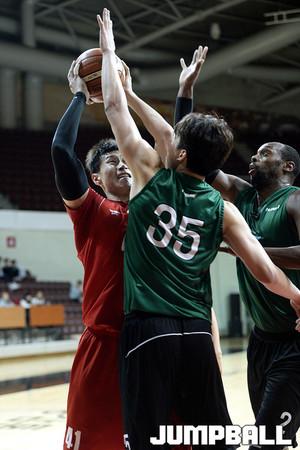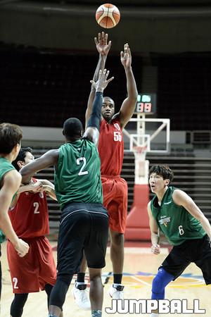 07일 안양 실내체육관 에서 열린 원주 동부 와 안양 KGC 의 연습경기, KGC 오세근이 동부 서민수와 리바운드를 다투고있다.