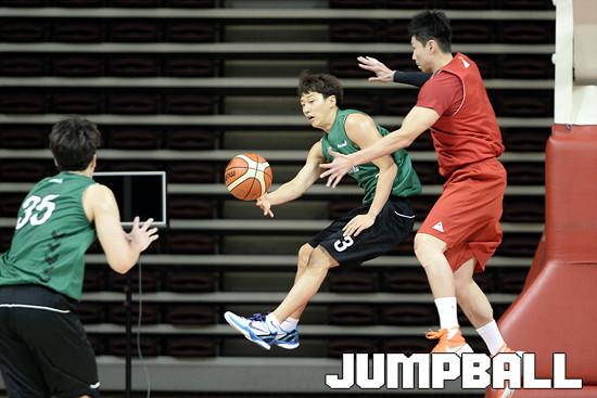 07일 안양 실내체육관 에서 열린 원주 동부 와 안양 KGC 의 연습경기, 동부 허웅이 KGC 오세근을 따돌리며 패스를 해주고있다.