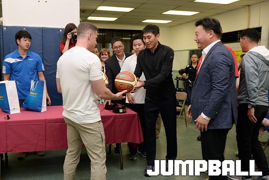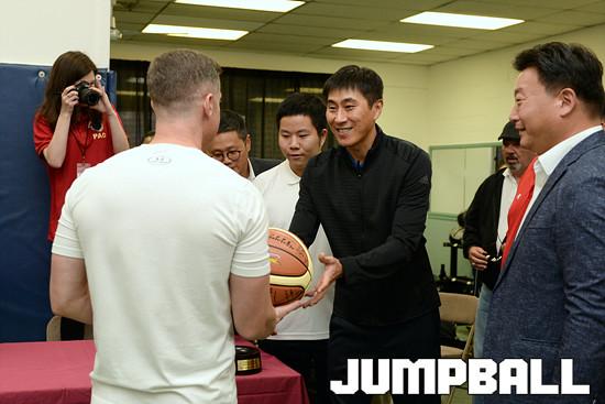 08일 용산 미군부대내 체육관 에서 열린 삼성 썬더스 농구단 과 미국팀의 친선 경기, 삼성 썬더스 이상민 감독이 미8군 용산지역 사령관인 스캇 피터슨 대령에게 기념공을 전달하고있다.