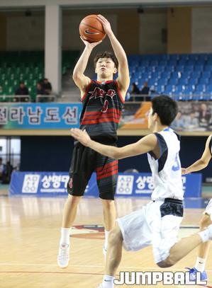 프로 선수 출신으로 구성된 상무가 11일 천안 상명대 체육관에서 열린 제97회 전국체전 남자 일반부 경기에서 82-51로 전주 우석대를 꺾고 4강에 올랐다.