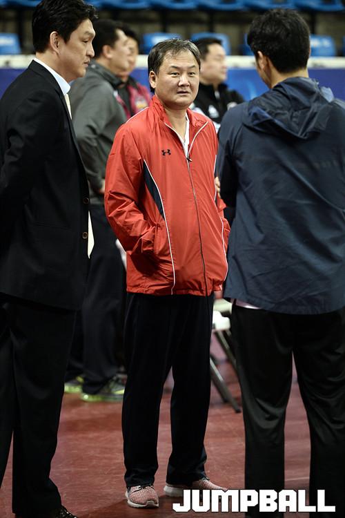 18일 잠실 학생체육관에서 열린 2016 KBL 국내신인선수 트라이아웃, 1순위 지명권을 가진 모비스 유재학 감독이 여유있는 모습으로 구단관계자와 이야기를 나누고있다.