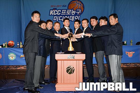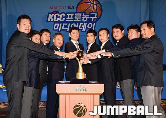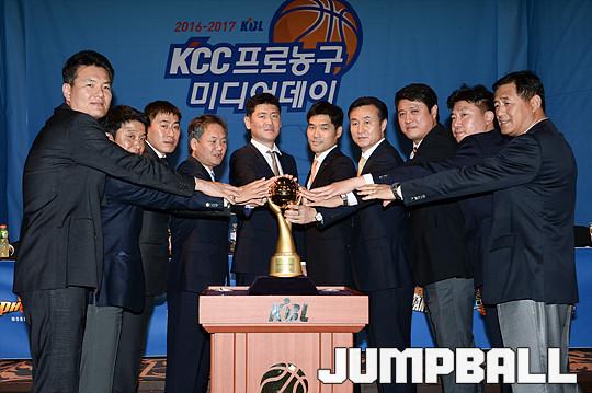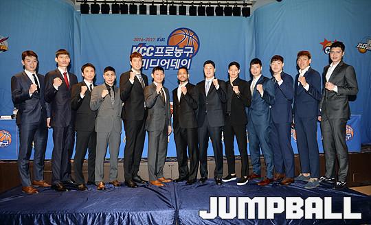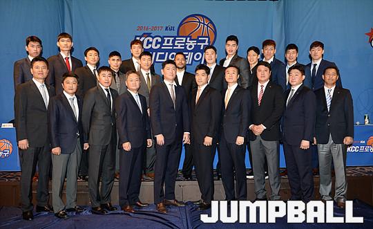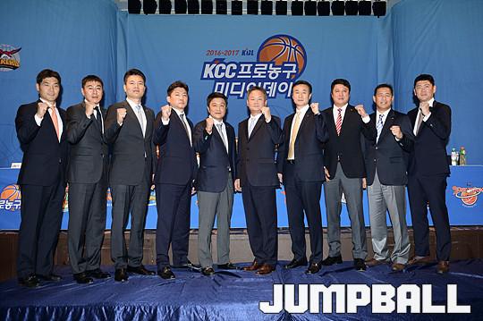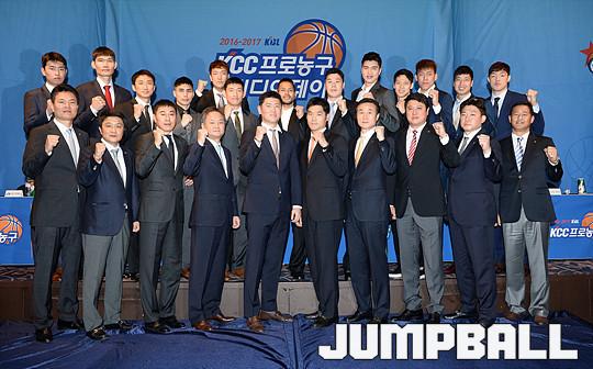 [점프볼=청담/유용우 기자] 19일 청담동 리베라 호텔에서 열린 '16-17 KCC 프로농구 미디어데이' 감독들이 프로피에 손을 얻고 포즈를 취하고 있다.