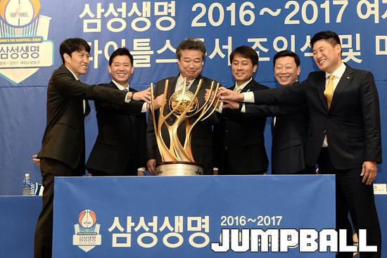 25일 양재동 더케이호텔 컨벤션센터 3층 크리스탈 볼륨에서 열린 '삼성생명 2016~2017 여자프로농구' 타이틀스폰서 조인식 및 미디어데이, 6개 구단 감독들이 우승 트로피를 잡으며 기념 촬영을 하고있다.