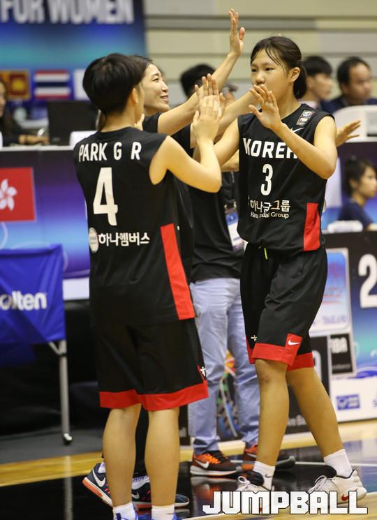 15일 태국 방콕 유스 센터에서 열린 2016 FIBA 아시아 U18여자 농구대회 예선전 사흘 째 경기, 한국 대표팀의 막내 박지현이 3점슛을 터트린 뒤 벤치로 돌아오자 동료들의 환호를 받고 있다.