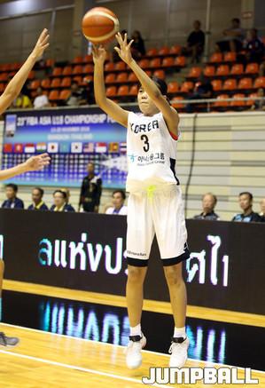 20일 태국 방콕 유스 센터에서 열린 2016 FIBA 아시아 U18여자 농구대회 3-4위 전, 한국 대표팀의 김두나랑이 자신 보다 큰 선수를 상대로 골밑 공격을 펼치고 있다.