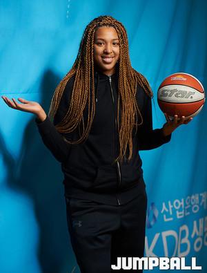 [점프볼=구리/유용우 기자] 08일 구리시체육관에서 KDB생명 티아나 하킨스(25, 191cm)가 인터뷰를 마치고 촬영을 진행하고 있다. 하킨스의 옆에는 그녀의 복덩이 아들 ‘이마누엘’이 함께 했다. KDB생명은 5승 7패로 리그 3위를 달리고 있다.