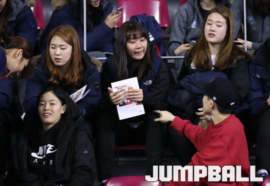 15일 용인 실내체육관에서 열린 삼성생명 2016-2017 여자프로농구 올스타전, 오픈 경기가 열리고 있는 가운데 관중석에서 신한은행 유승희와 삼성생명 박태은이 이야기를 나누고 있다.