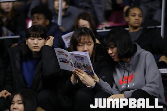15일 용인 실내체육관에서 열린 삼성생명 2016-2017 여자프로농구 올스타전, 오픈 경기가 열린 가운데 삼성생명 선수들이 팜플렛을 보며 출전 선수들을 둘러보고 있다.