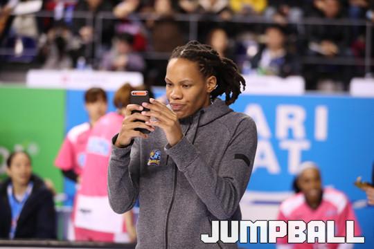 15일 용인 실내체육관에서 열린 삼성생명 2016-2017 여자프로농구 올스타전, 3점슛 대회에 출전한 동료 선수를 촬영하고 있는 우리은행 모니크 커리