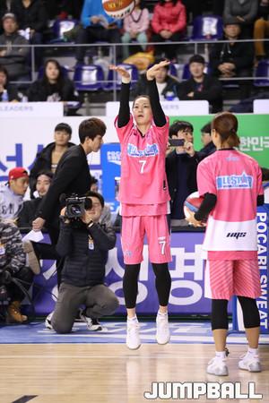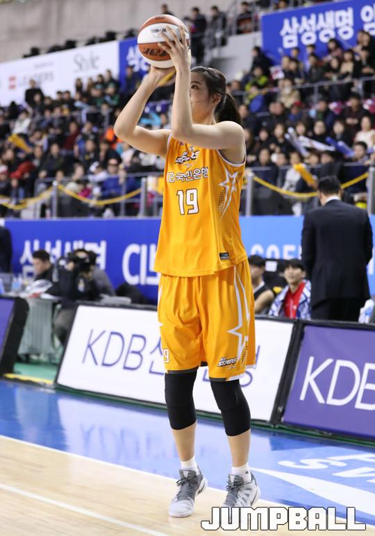 15일 용인실내체육관에서 열린 2016-2017 여자프로농구 올스타전 라이징스타와 연예인올스타의 경기, 라이징스타팀의 박지수가 외곽으로 빠져나와 3점슛을 던지고 있다.