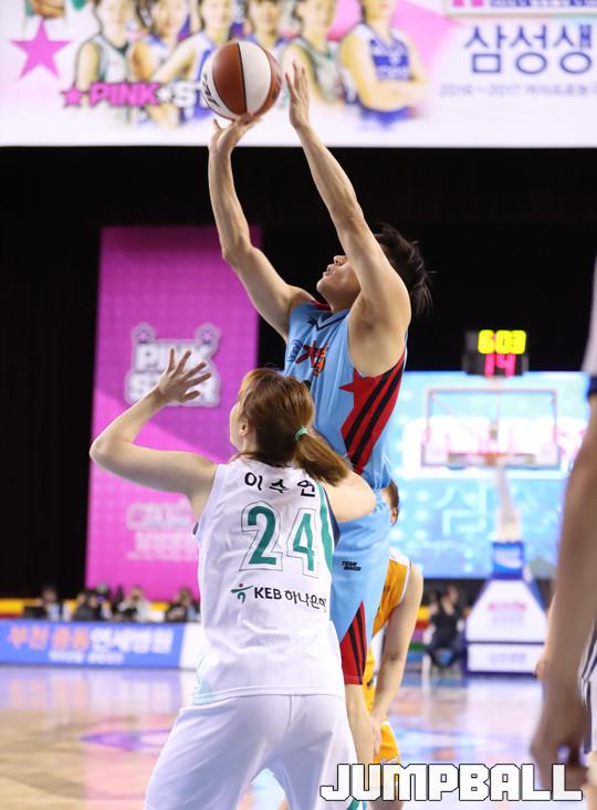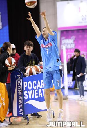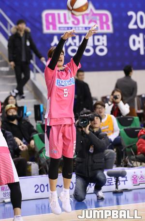 15일 용인실내체육관에서 열린 2016-2017 여자프로농구 올스타전 라이징스타와 연예인올스타의 경기, 연예인 올스타팀의 JYP가 골밑 공격을 펼치며 득점을 만들어 내고 있다.