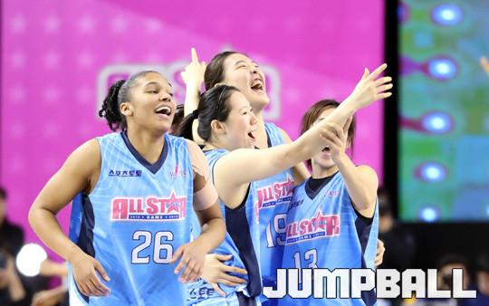 15일 용인실내체육관에서 열린 2016-2017 여자프로농구 올스타전, 블루스타의 박지수의 결승득점으로 승리를 확정짓자 블루스타 선수들이 좋아라 하고 있다.