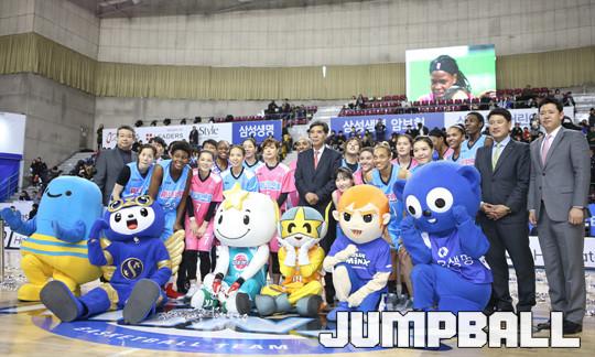 15일 용인실내체육관에서 열린 2016-2017 여자프로농구 올스타전에 참가한 모든 선수들이 기념촬영을 하고 있다.