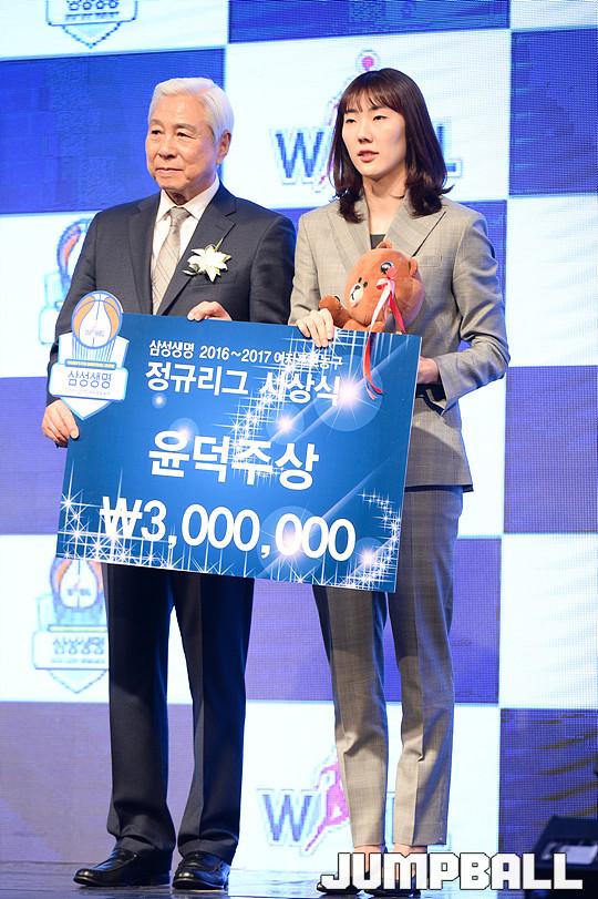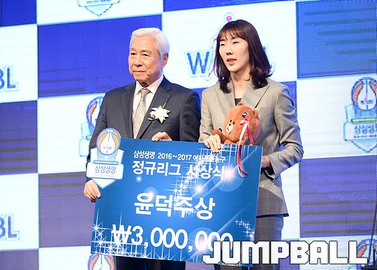 [점프볼=양재/유용우 기자] 07일 양재동 더케이호텔(구, 교육문화회관) 컨벤션센터 2층 그랜드 볼룸에서 '삼성생명 16-17 여자프로농구 정규리그 시상식'이 개최되었다. 우리은행 박혜진이 윤덕주상을 수상하였다.