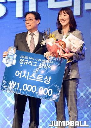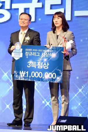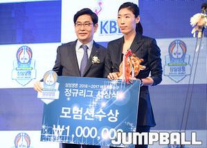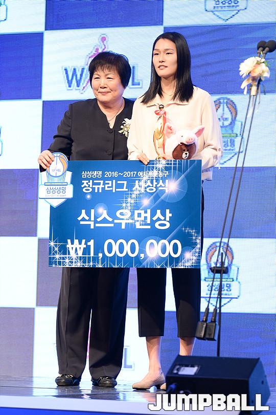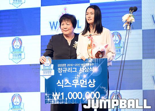 [점프볼=양재/유용우 기자] 07일 양재동 더케이호텔(구, 교육문화회관) 컨벤션센터 2층 그랜드 볼룸에서 '삼성생명 16-17 여자프로농구 정규리그 시상식'이 개최되었다. 우리은행 최은실이 식스우먼상을 수상하였다.