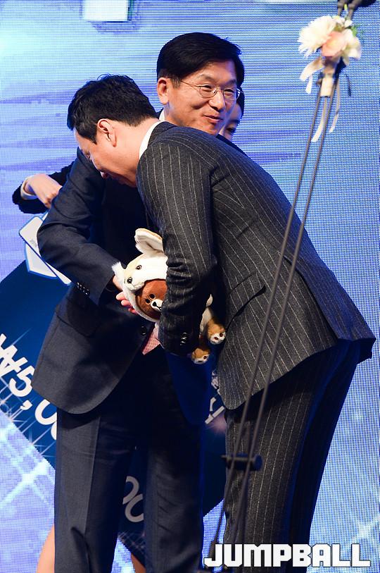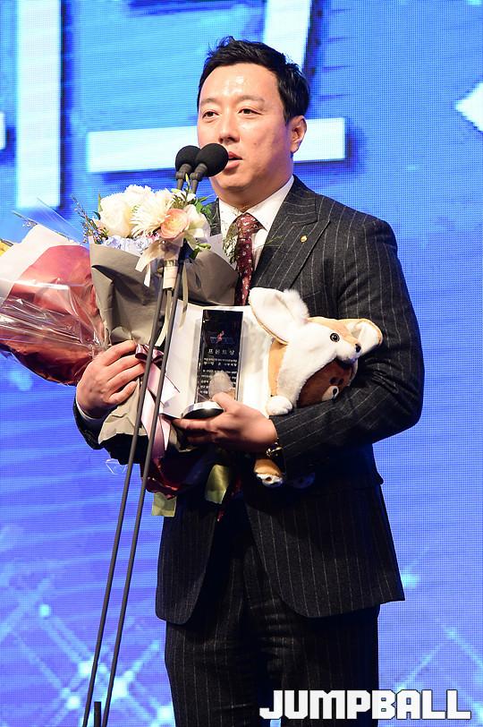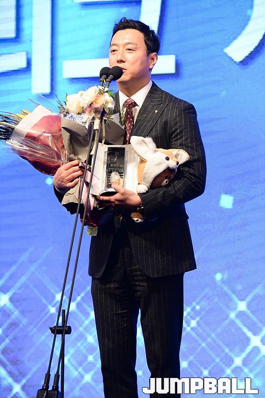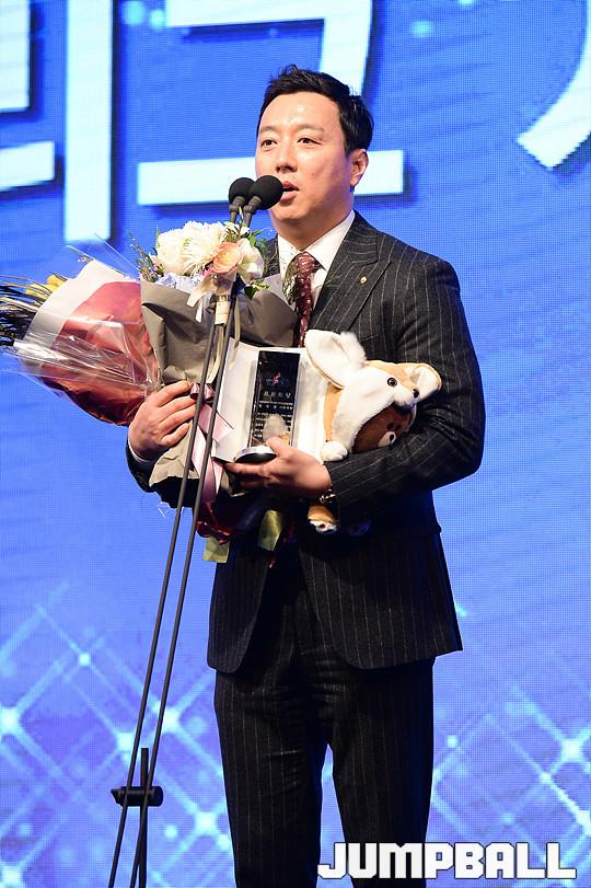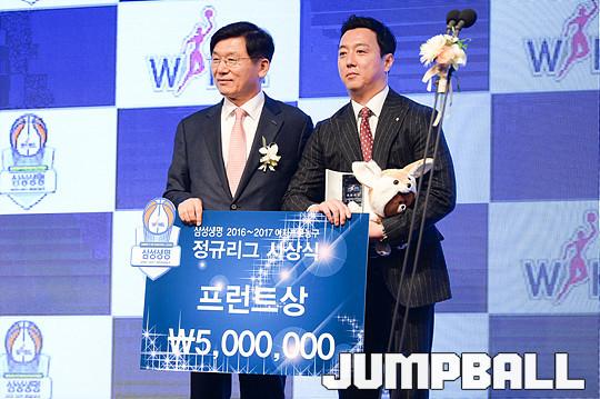 [점프볼=양재/유용우 기자] 07일 양재동 더케이호텔(구, 교육문화회관) 컨벤션센터 2층 그랜드 볼룸에서 '삼성생명 16-17 여자프로농구 정규리그 시상식'이 개최되었다. 우리은행 정장훈 국장이 프런트상을 수상하고 있다.