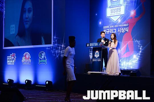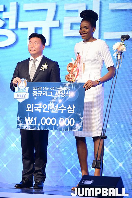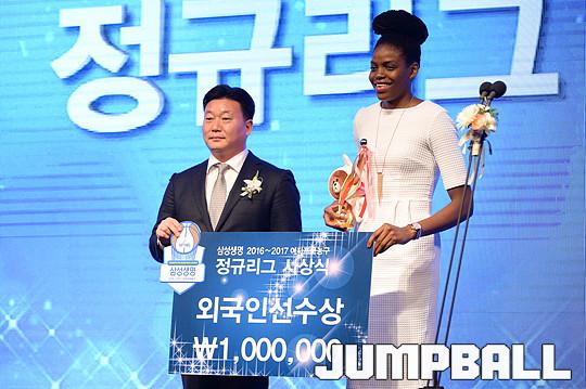 [점프볼=양재/유용우 기자] 07일 양재동 더케이호텔(구, 교육문화회관) 컨벤션센터 2층 그랜드 볼룸에서 '삼성생명 16-17 여자프로농구 정규리그 시상식'이 개최되었다. 우리은행 존쿠엘 존스가 외국인선수상을 수상하고 있다.