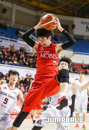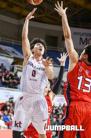 15일 오후 울산 동천체육관에서 열린 울산 모비스와 부산 KT의 경기에서 KT 김현민이 모비스 함지훈의 수비를 피해 슛을 하고 있다.