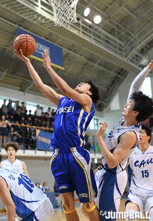 16일 연세대학교 체육관에서 열린 2017 남녀 대학농구리그에서 연세대와 중앙대의 경기, 중앙대 이우정이 골밑을 저돌적으로 파고들어 레이업을 시도하고 있다.