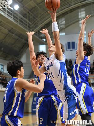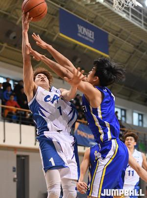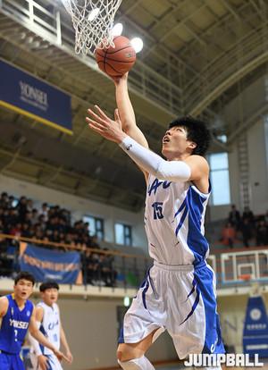 17일 경희대학교 체육관에서 열린 2017 남녀 대학농구리그에서 경희대와 건국대의 경기, 건국대 이진욱이 순간 돌파로 수비를 제치고 레이업을 시도하고 있다.