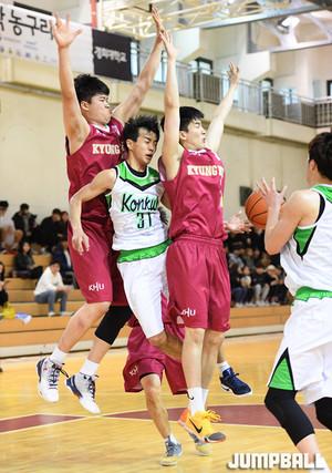 17일 경희대학교 체육관에서 열린 2017 남녀 대학농구리그에서 경희대와 건국대의 경기, 경희대 김현국 감독이 작전 하나를 지시하고 있다.