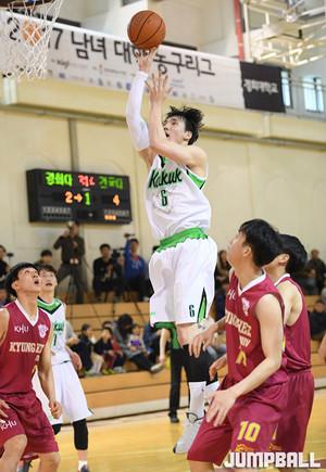 17일 경희대학교 체육관에서 열린 2017 남녀 대학농구리그에서 경희대와 건국대의 경기, 경희대 이민영이 골밑슛을 시도하는 건국대 이상훈의 공격을 저지하고 있다.