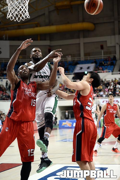 19일 울산 동천 체육관에서 열린 '16-17 KCC 프로농구' 울산 모비스 와 원주 동부 의 경기, 동부 맥키네스가 모비스 허버트힐의 리바운드를 쳐내고있다.