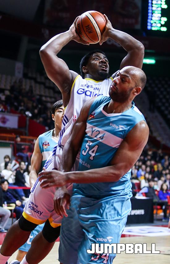 9일 오후 부산 사직실내체육관에서 열린 부산 KT와 서울 삼성의 경기에서 삼성 크레익이 KT 윌리엄스의 수비를 피해 슛을 시도하고 있다.