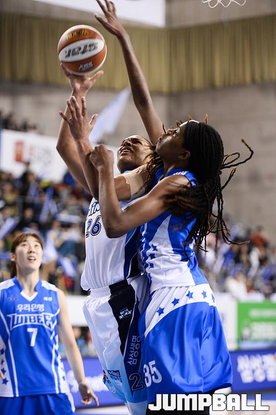 [점프볼=용인/유용우 기자] 20일 용인 실내체육관에서 진행된 '삼성생명 2016-2017 여자프로농구' 챔피언결정전 3차전 삼성생명과 아산 우리은행의 경기, 삼성생명 토마스가 우리은행 존스의 수비를 두고 슛을 시도하고 있다.
