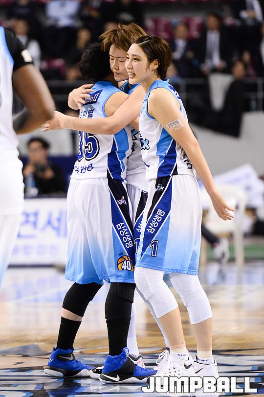 [점프볼=용인/유용우 기자] 20일 용인 실내체육관에서 진행된 '삼성생명 2016-2017 여자프로농구' 챔피언결정전 3차전 삼성생명과 아산 우리은행의 경기, 삼성생명 김한별과 허윤자가 공격을 성공시키고 서로 포옹하고 있다.