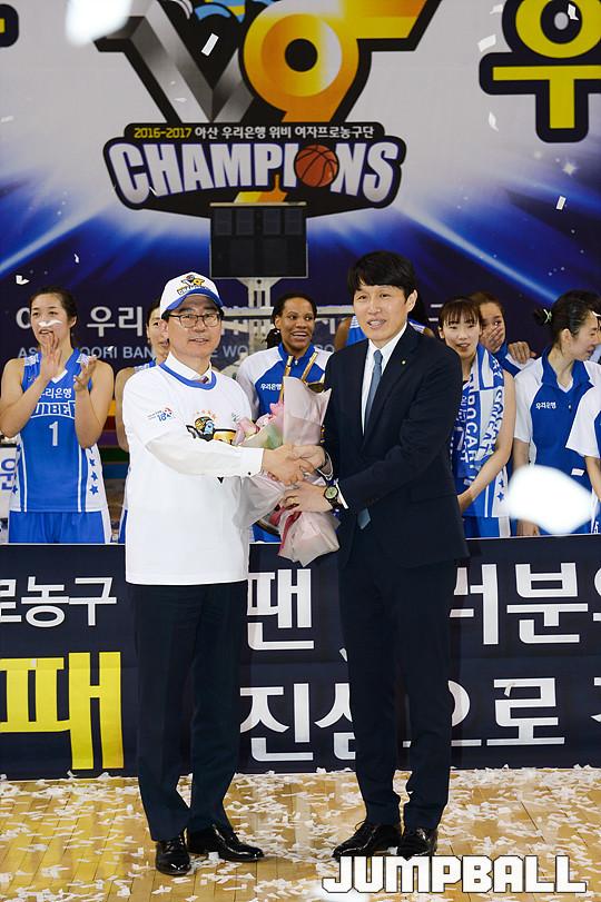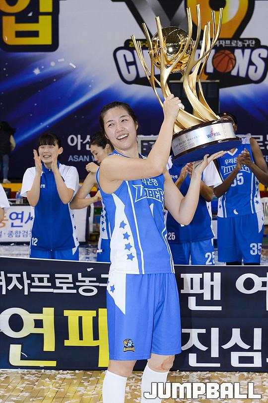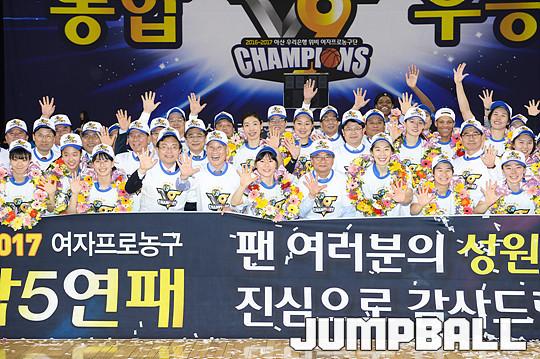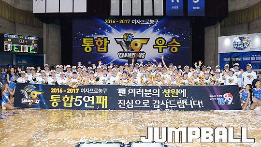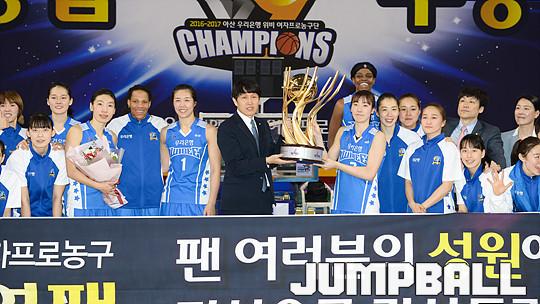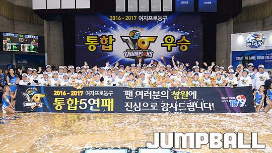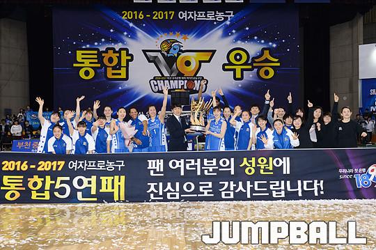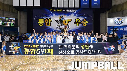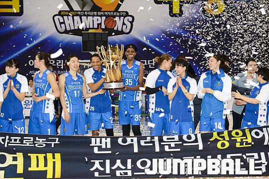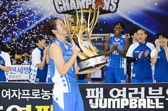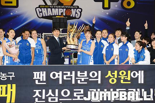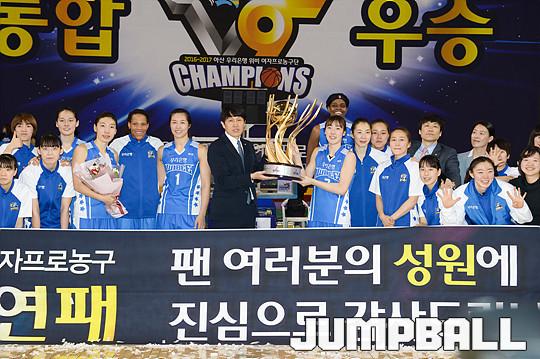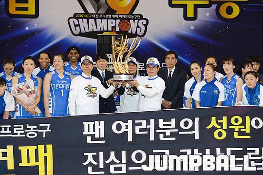 [점프볼=용인/유용우 기자] 20일 용인 실내체육관에서 진행된 '삼성생명 2016-2017 여자프로농구' 챔피언결정전 3차전 삼성생명과 아산 우리은행의 경기, 우리은행이 83-72로 승리하며 통합 5연패를 달성하였다. 우리은행 양지희가 우승 트로피를 들고 승리를 만끽하고 있다.