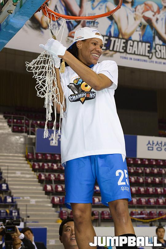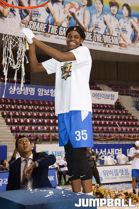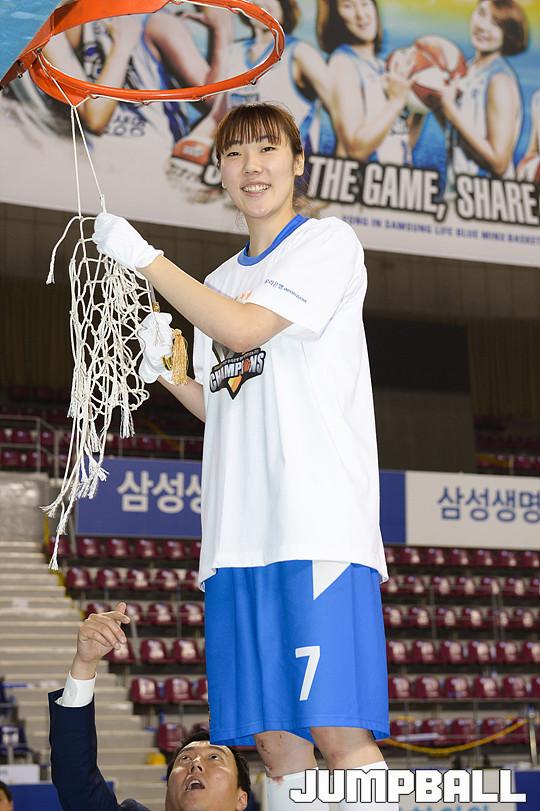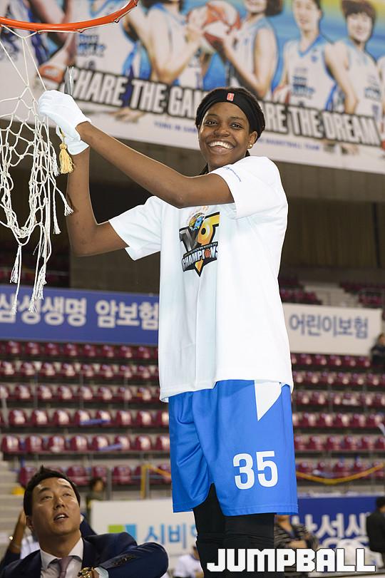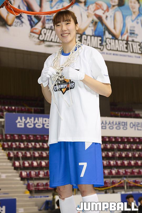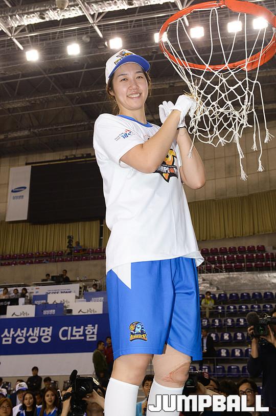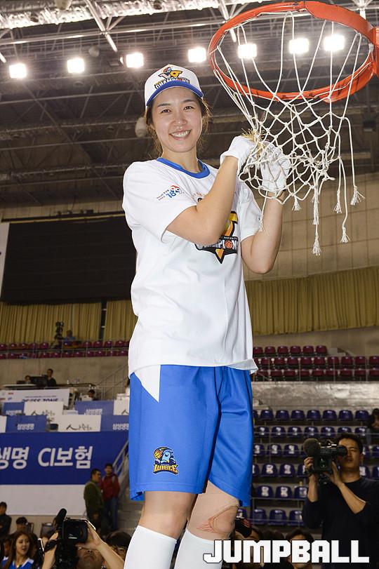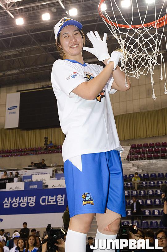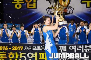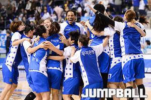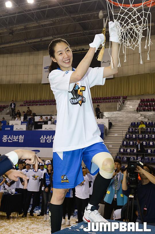 [점프볼=용인/유용우 기자] 20일 용인 실내체육관에서 진행된 '삼성생명 2016-2017 여자프로농구' 챔피언결정전 3차전 삼성생명과 아산 우리은행의 경기, 우리은행이 83-72로 승리하며 통합 5연패를 달성하였다. 우리은행 선수들이 그물을 커팅하며 승리의 기쁨을 누리고 있다.