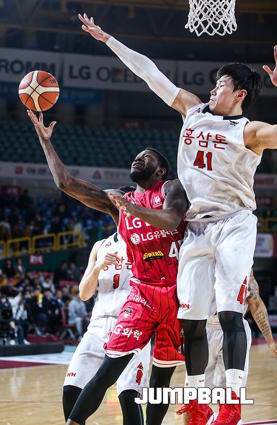 21일 오후 창원 실내체육관에서 열린 창원 LG와 안양 KGC의 경기에서 LG 리틀이 KGC 오세근의 수비를 피해 슛을 하고 있다.