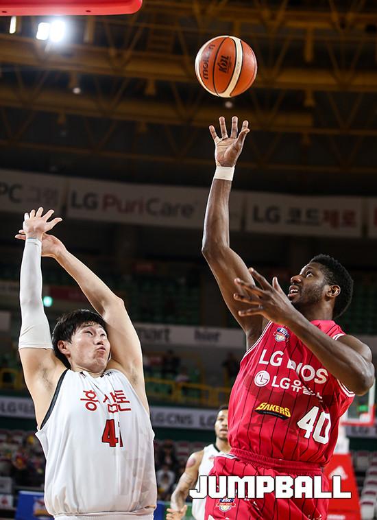 21일 오후 창원 실내체육관에서 열린 창원 LG와 안양 KGC의 경기에서 LG 메이스가 KGC 오세근의 수비를 피해 슛을 하고 있다.