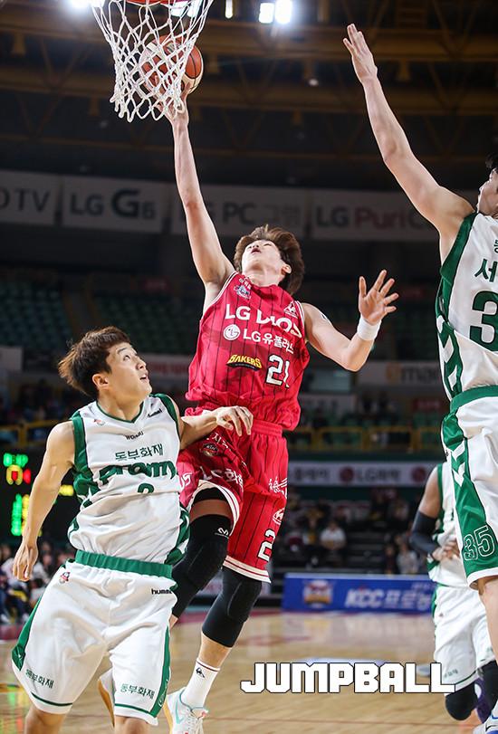 23일 오후 창원 실내체육관에서 열린 창원 LG와 원주 동부의 경기에서 LG 최승욱이 동부 허웅의 수비를 피해 슛을 하고 있다.