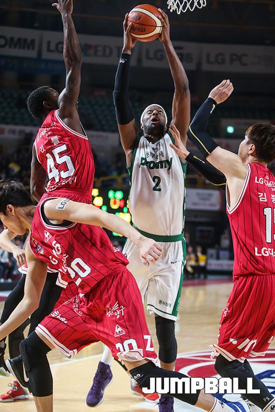 23일 오후 창원 실내체육관에서 열린 창원 LG와 원주 동부의 경기에서 동부 벤슨이 LG 리틀의 수비를 피해 슛을 하고 있다.