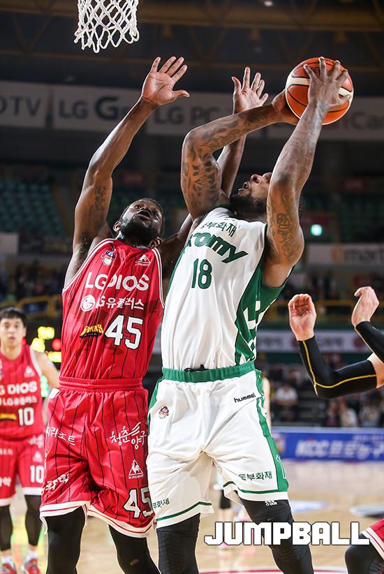 23일 오후 창원 실내체육관에서 열린 창원 LG와 원주 동부의 경기에서 동부 맥키네스가 LG 리틀의 수비를 피해 슛을 하고 있다.