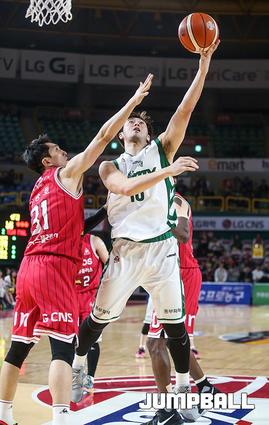 23일 오후 창원 실내체육관에서 열린 창원 LG와 원주 동부의 경기에서 동부 김태홍이 LG 기승호의 수비를 피해 슛을 하고 있다.