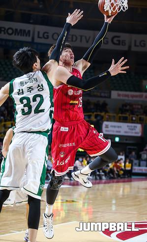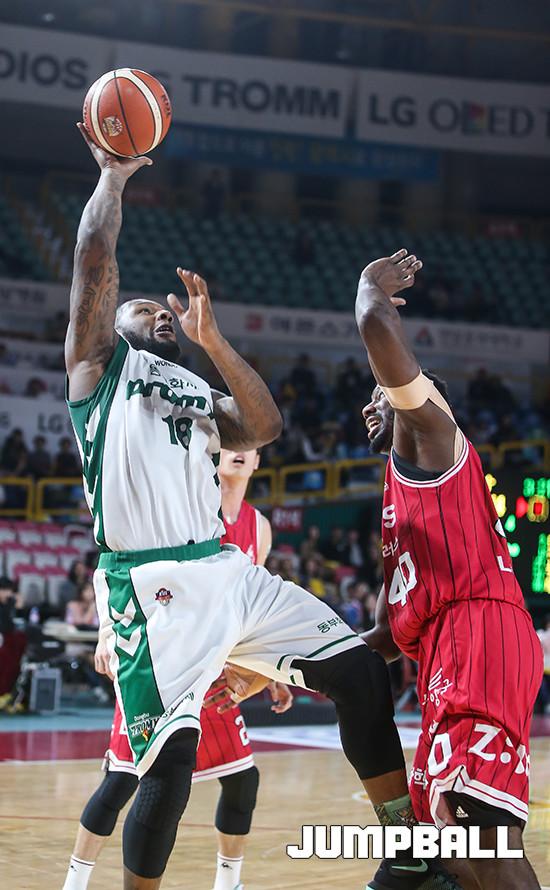 23일 오후 창원 실내체육관에서 열린 창원 LG와 원주 동부의 경기에서 동부 맥키네스가 LG 메이스의 수비를 피해 슛을 하고 있다.