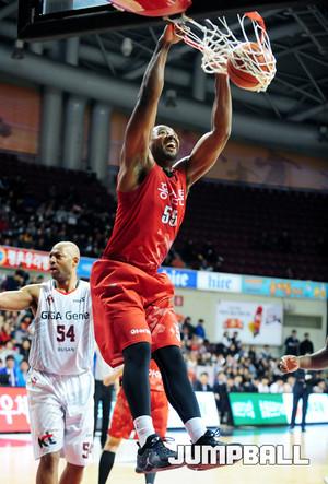 26일 안양실내체육관에서 열린 '16-17 KCC 프로농구' 안양 KGC와 부산 케이티의 경기에서, KGC인삼공사 사이먼이 골밑슛을 시도하고 있다.
