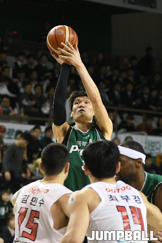 26일 원주종합체육관에서 열린 '16-17 KCC프로농구 원주 동부 와 서울 SK 의 경기에서 김주성이 3점슛을 시도하고 있다.