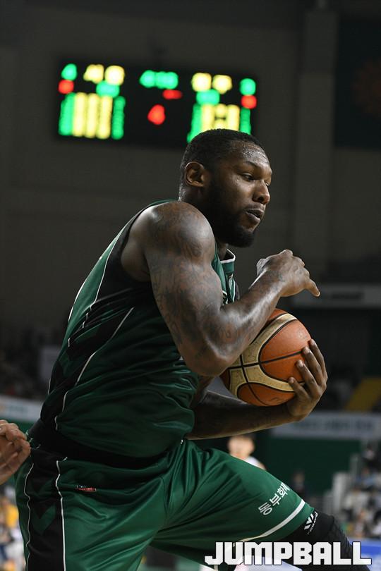 26일 원주종합체육관에서 열린 '16-17 KCC프로농구 원주 동부 와 서울 SK 의 경기에서 웬델 맥키네스가 리바운드를 잡아내고 있다.