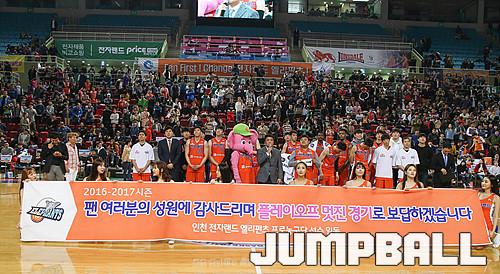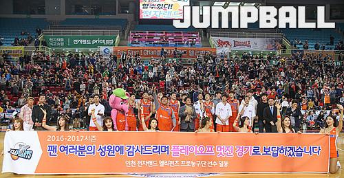 [점프볼=인천/한명석 기자] 26일 인천삼산월드체육관에서 열린 '16-17 KCC 프로농구' 인천 전자랜드와 전주 KCC와의 경기에서 인천 전자랜드 선수단이 팬들에게 플레이오프 진출에 대한 세레모니행사를 진행하고 있다.