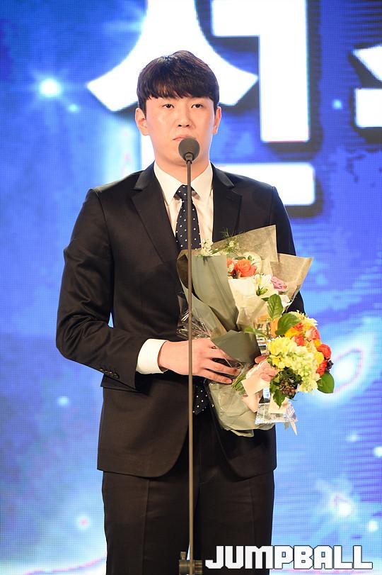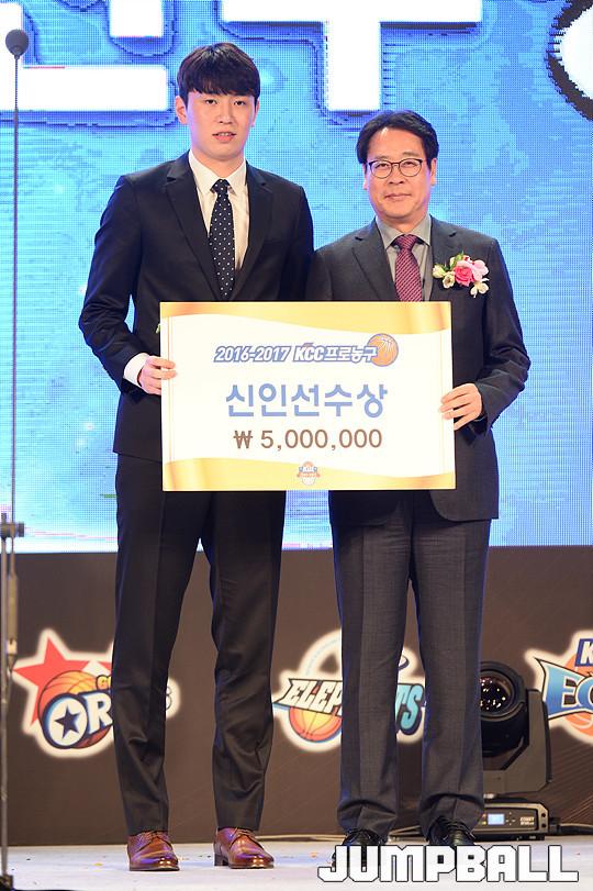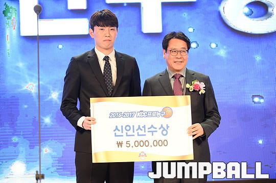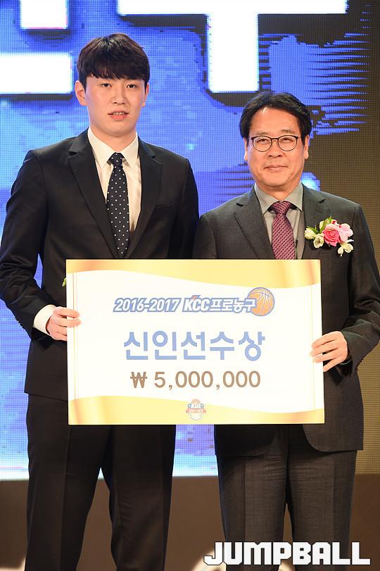 [점프볼=용산/유용우 기자] 27일 그랜드 하얏트 호텔 그랜드볼룸에서 열린 '16-17 KCC 프로농구 시상식' 전자랜드 강상재가 신인상을 수상받고 있다.